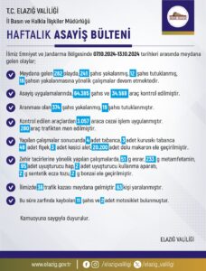 Elazığ Valiliği, Elazığ’ın haftalık asayiş bültenini paylaştı.